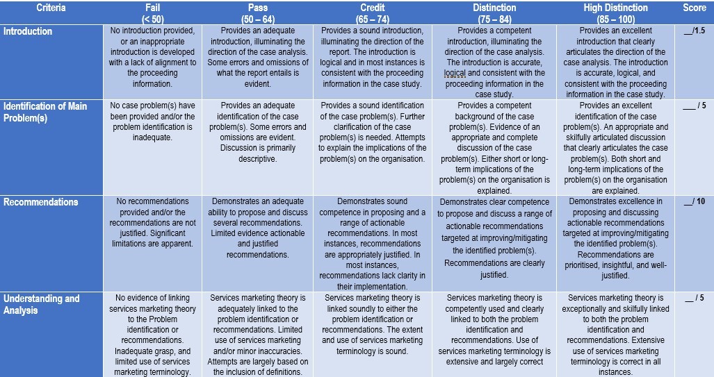 This is a section that sits within your marking rubric but is NOT a separate section within your case study. Understanding and analysis requires that each component of your report features the appropriate services marketing terminology throughout the discussion and is done so correctly. Please note that this does not require definitions to be added to your discussion, as the inclusion of definitions does not demonstrate your understanding and analysis of the services marketing concepts. Concepts you can include but are not limited to: